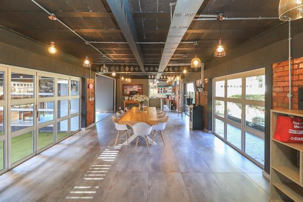 Inside, industrial elements are softened by the thoughtful use of old wood, polished finishes, and creative colour accents. The open-plan living areas flow effortlessly from the welcoming lounge into a spacious dining room, all overlooking a landscaped courtyard garden that conceals a private, hidden swimming poolan intimate retreat ingeniously positioned between the homes architectural buttresses.