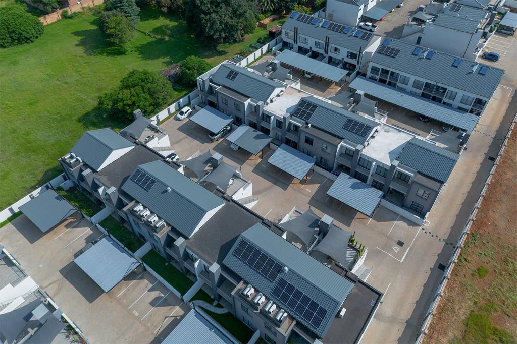 The complex itself features a stylish, modern exterior with dark and light grey tones, and solar panels on the roofs.