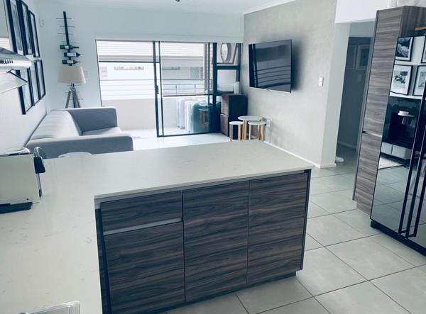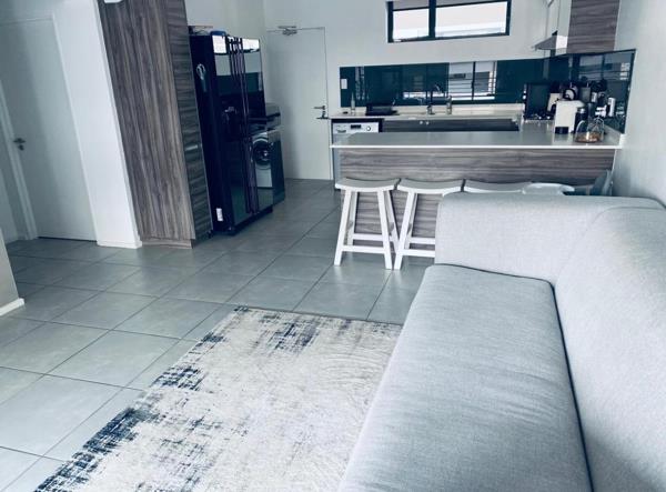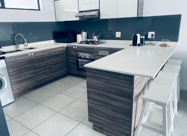 Discover modern living in this stylish 78 sqm apartment located within a secure complex in Rynfield, Benoni. The contemporary architectural design, featuring clean lines and brick accents, creates an inviting first impression. Step inside to an open-plan living area seamlessly integrated with a sleek, modern kitchen. The kitchen boasts two-tone cabinetry, white stone-look countertops, a dark grey glass backsplash, and integrated appliances, including a built-in washing machine. A functional breakfast bar and a stylish island with dark wood cabinetry complete this well-appointed space, all set on easy-to-maintain tiled flooring.