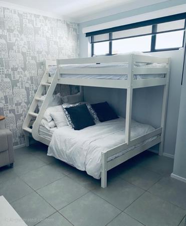 The apartment offers two comfortable bedrooms and two bathrooms, with one being an en-suite for added privacy. The main bedroom presents a neutral palette, a dark upholstered bed, and natural light from two tall windows, complemented by a textured accent wall. The second bedroom features a versatile white wooden bunk bed and playful city-themed wallpaper, ideal for children or guests. Ample storage is provided by a large, modern grey wood-grain built-in wardrobe and an additional white dresser. Both bathrooms are designed with modern floating vanities and glass-enclosed showers.