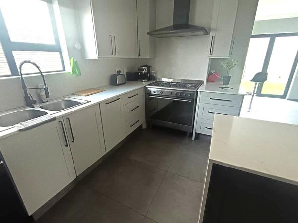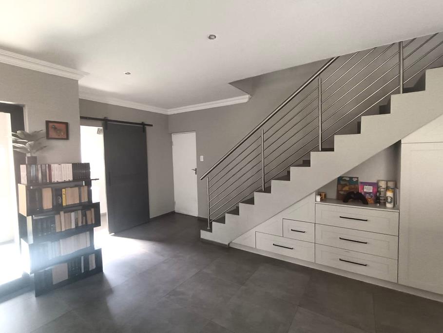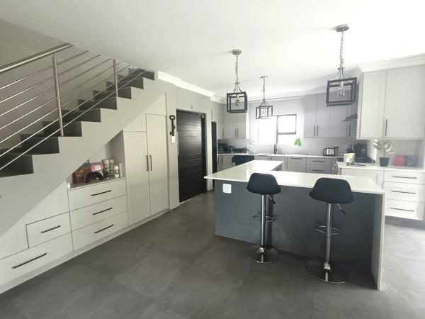 Step inside to an open-plan layout that seamlessly connects the main living areas. The home features two lounges, with a main lounge downstairs and the possibility of a second lounge upstairs. The open-plan dining room is spacious and extremely modern. The modern kitchen is equipped with a pantry and an integrated braai room, offering an ideal spot for indoor grilling and social gatherings.