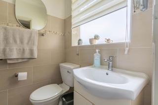 The property features three cosy bedrooms, all with built-in cupboards. The main bedroom includes a modern en-suite bathroom, wooden floors, and comfortably accommodates a queen-size bed. A second full bathroom offers a shower and a luxurious spajacuzzi bath.