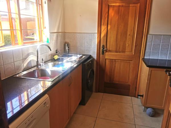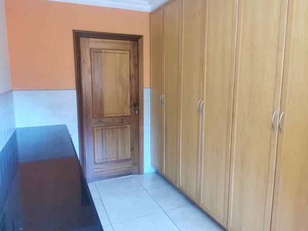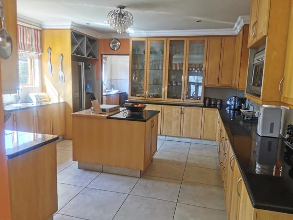 Modern kitchen with gas stove, scullery, and plenty of cupboard space.