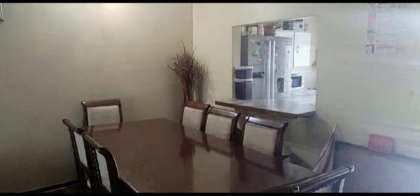 The kitchen is well-appointed with durable steel cabinets and a single bowl sink. It offers plenty of room to accommodate a large double-door fridge. Additionally, a convenient serving hatch connects the kitchen to the dining room, making meal service both easy and efficient.