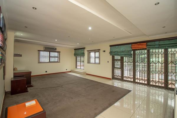 Step into refined elegance as a grand entrance hall with a striking water feature sets the tone for this exceptional double-storey residence. Designed for sophisticated living, the home offers expansive open-plan spaces that flow seamlessly, including a private cinema room, spacious family lounge, and 2 fully fitted studies with granite tops, built-in desks, and shelving. A dedicated prayer room adds a quiet retreat within the home, while a private gym and steam room open onto beautifully landscaped garden areas for complete wellness and relaxation.