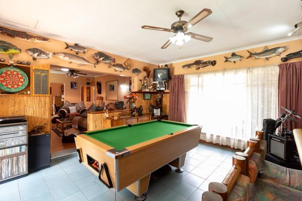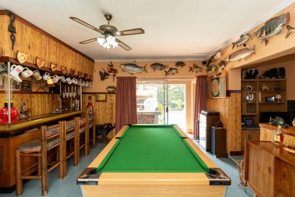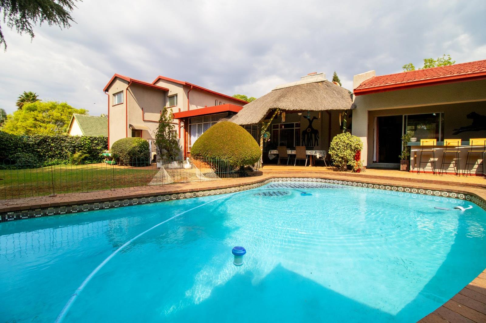 Inside, natural light pours into the open-plan dining room and lounge, which flow effortlessly into a delightful sunroomperfect for winter reading and cozy afternoons. For moments of fun and relaxation, the family room at the far end is ideal, complete with an outdoor bar under a thatched roof, overlooking a stunning, sparkling pool. Entertain guests with ease using the covered braai area next to the pool, perfect for summer get-togethers.