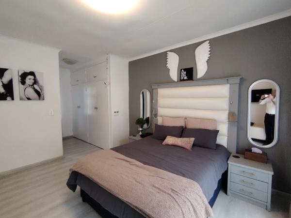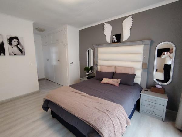 This stunning modern home offers 3 spacious bedrooms, all fitted with built-in cupboards and sleek laminated flooring. The main bedroom includes a stylish en-suite bathroom with a shower and basin. A second bathroom and a convenient guest toilet serve the rest of the home.