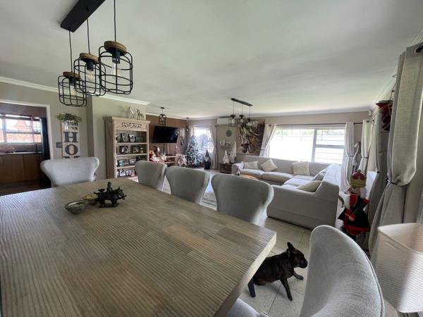 Dining room with aluminium sliding door leading to patio and pool area