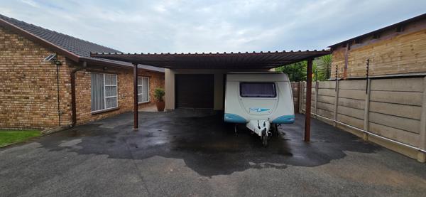 Outdoor living is well-catered for, with the expansive erf providing ample space for recreation and relaxation. The property includes a built-in braai, perfect for outdoor entertaining and social gatherings. The large covered carport and double garage not only provide secure parking but also offer significant storage solutions. The overall design of the outdoor spaces complements the interior, creating a cohesive and functional living environment.