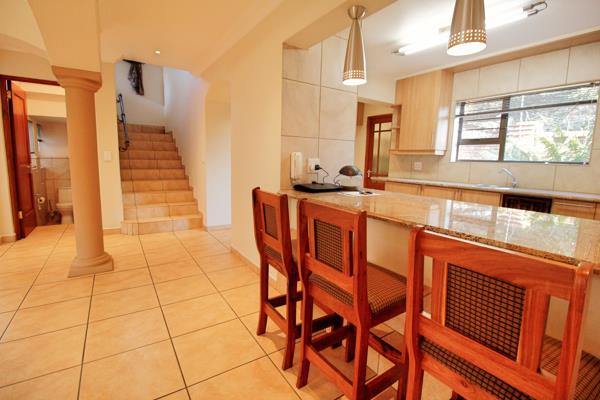 Enjoy year-round relaxation in the enclosed patio with a built-in braai, seamlessly blending indoor and outdoor living. The main bedroom, also situated downstairs, offers a private haven complete with air-conditioning, generous built-in cupboards, and a luxury en-suite bathroom featuring a double vanity, a freestanding bath, bidet, toilet, and a built-in heater.