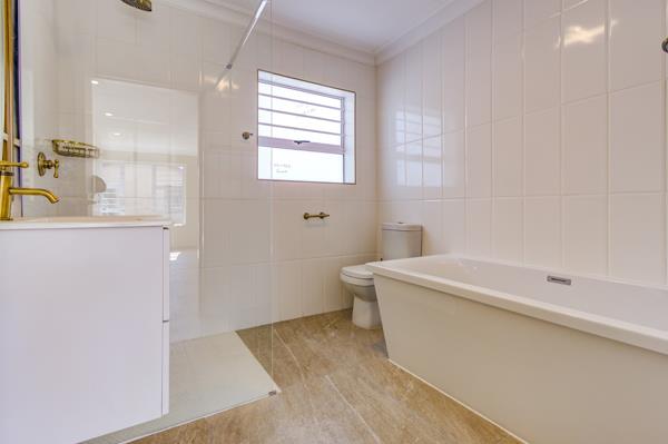 The home features four spacious bedrooms and three well-appointed bathrooms, including two en-suites, offering privacy and convenience. Bedrooms are equipped with built-in wardrobes for ample storage, and one includes a dedicated vanity desk. The bathrooms boast modern finishes, with one featuring a luxurious freestanding bathtub, a walk-in shower with a glass partition, and elegant brass fixtures, all set against clean white and light brown tiling.