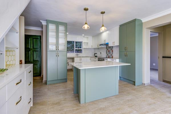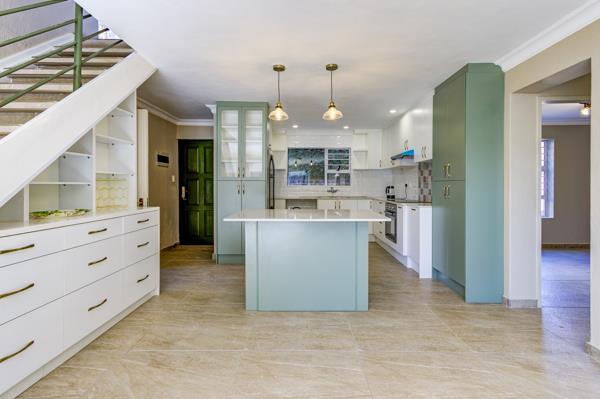 Inside, the bright, open-plan ground floor is designed for modern living. The recently renovated kitchen stands out with its stylish two-tone sage green and white cabinetry, a functional central island, and modern appliances. Integrated under-stair storage and display shelving maximise space, and the durable tiled flooring ensures a seamless flow throughout. The comfortable lounge area provides an ideal space for relaxation and family gatherings.