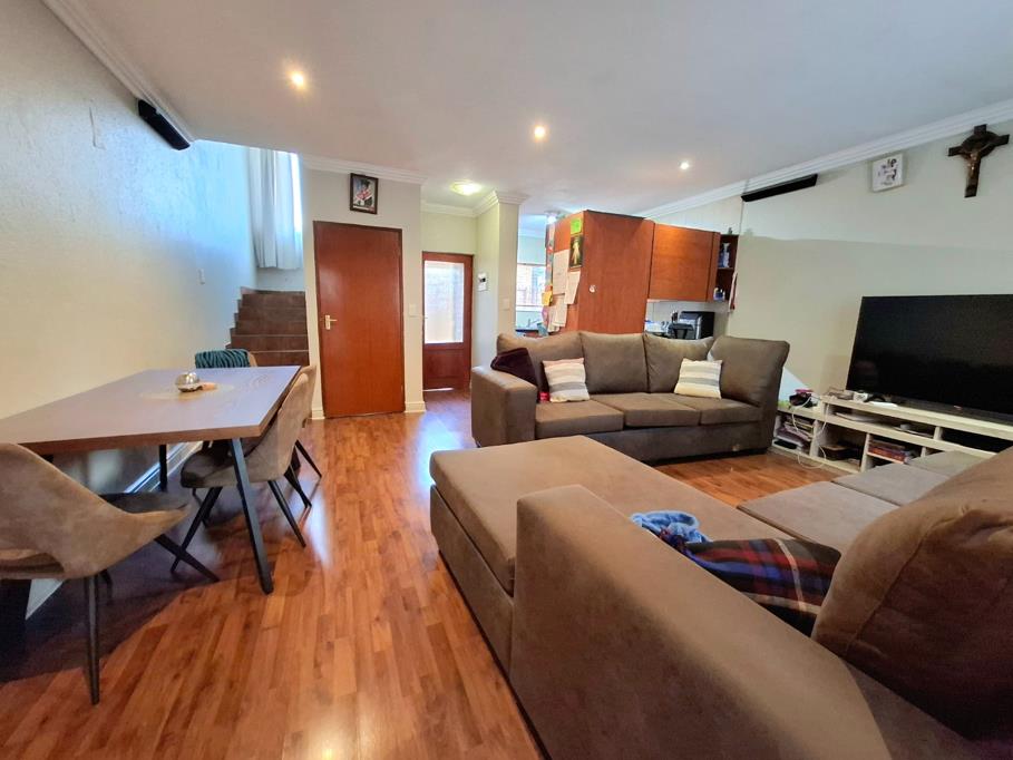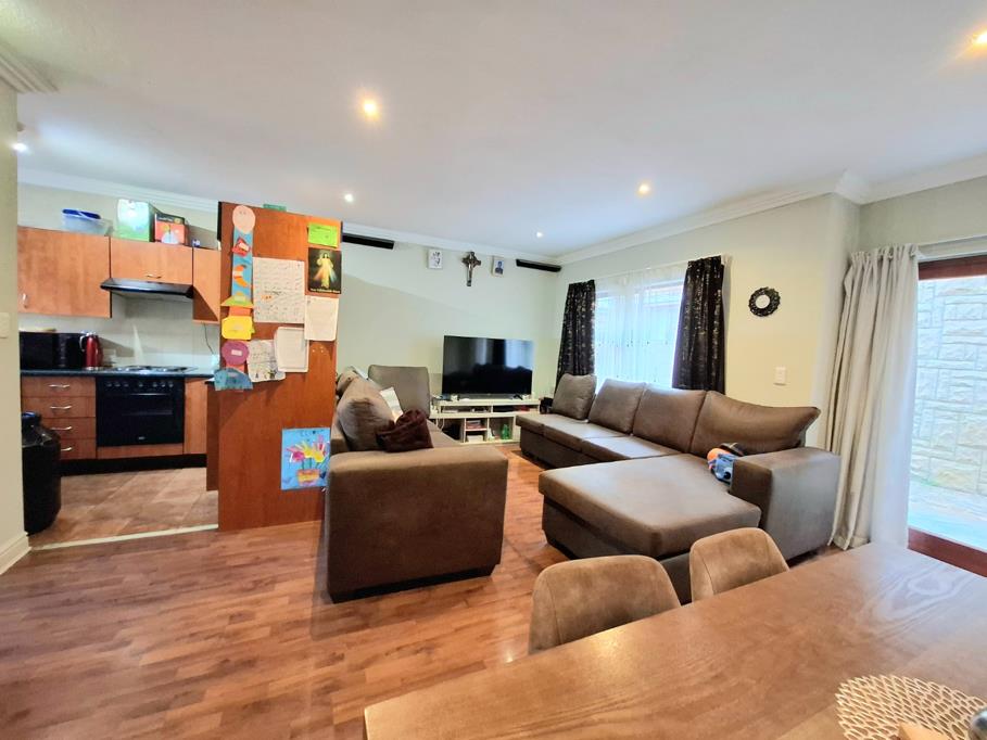 The front of the property welcomes you with a beautifully tiled patio and a built-in braai, perfect for entertaining or relaxing. Step through the sliding door into the open plan lounge and dining area, seamlessly flowing into a well appointed kitchen featuring ample cupboard space, room for a washing machine and dishwasher, and a practical under stair storage.
