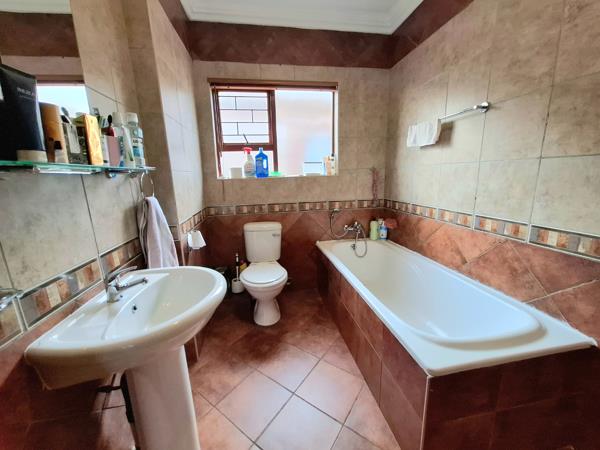 Upstairs offers two generously sized bedrooms, both with built-in cupboards. The master bedroom is bright and inviting, while the second bedroom comfortably fits a double bed. The full bathroom is a standout feature Spacious, beautifully tiled, and equipped with a bath, shower, toilet, and basin.