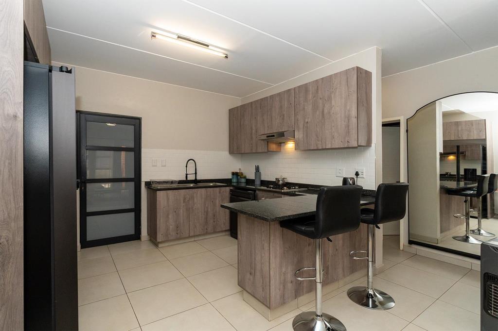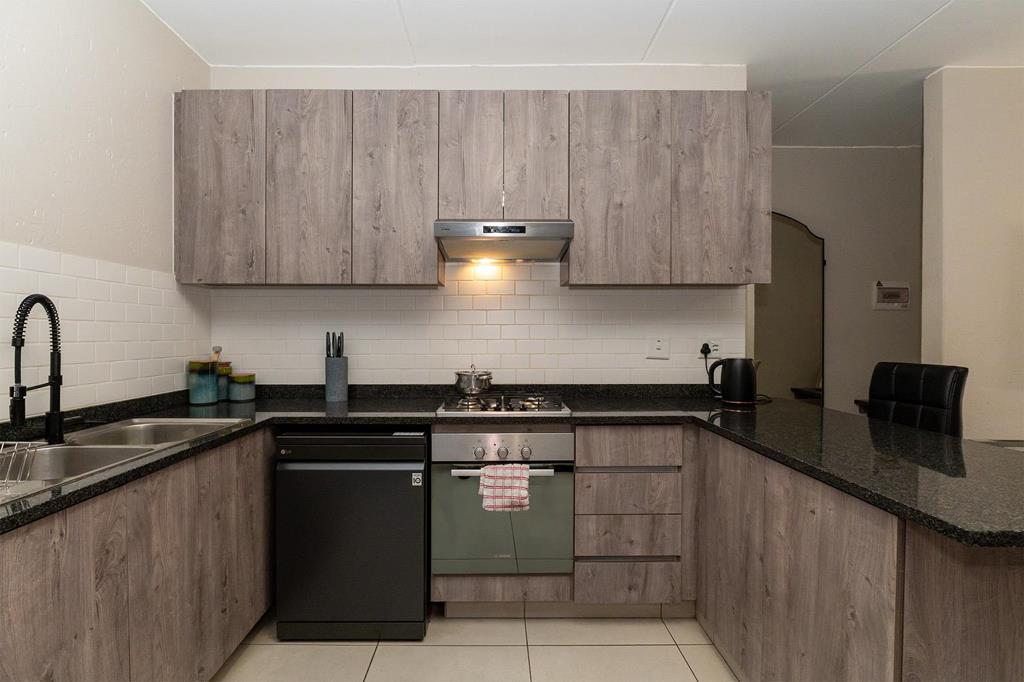 Gourmet open plan kitchen with breakfast counter, granite tops, under counter oven, gas hob, extractor fan, plumbing for washing machine and dishwasher and ample cupboards, spacious open plan tiled lounge leading to undercover tiled patio with built in braai overlooking spectacular garden, 3 good sized tiled bedrooms, 2 modern bathrooms with one being en-suite to main bedroom, linen cupboard, 2 basement parkings with stair and lift access,