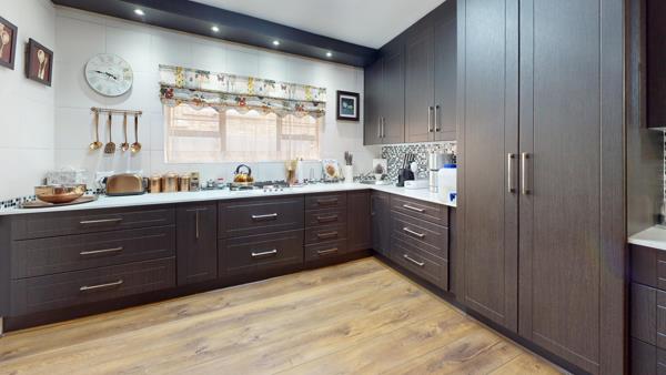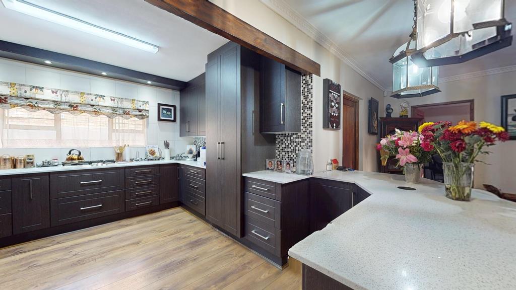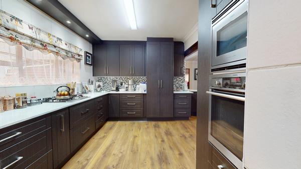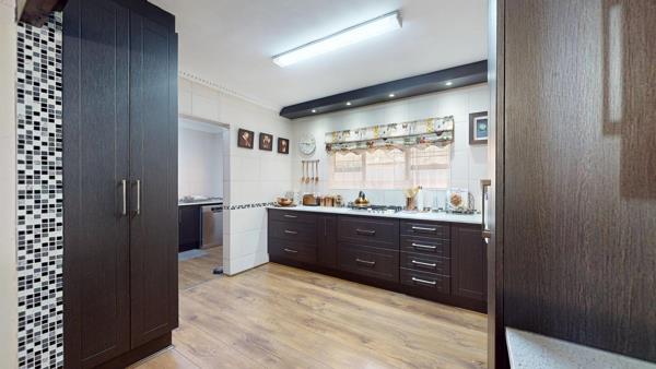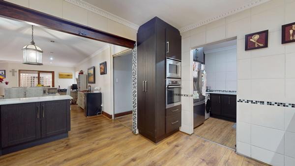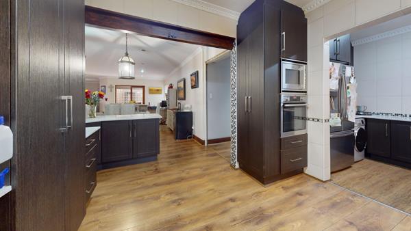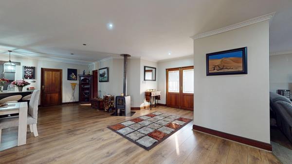 From the moment you step through the solid double wooden doors, you''re welcomed into a vast open-plan living area that exudes warmth and elegance. The expansive layout features laminated flooring throughout and includes a spacious lounge, dining area, separate study, guest toilet, and a dedicated entertainment space that seamlessly flows out to the private back garden. A large built-in braai is perfectly positioned just off the entertainment areaideal for year-round gatherings. A wood-burning fireplace adds a cozy touch to the living space during cooler months.