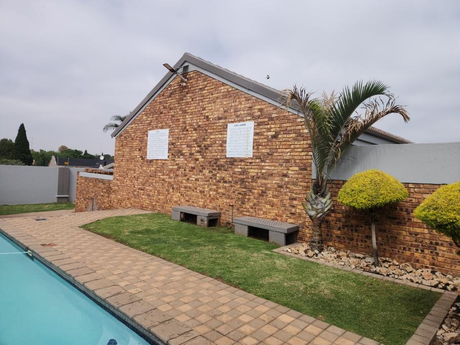 Externally, the property presents a robust brick facade, a paved driveway, and a covered entrance porch, contributing to its appealing kerb appeal. A communal outdoor area features a clean swimming pool, perfect for recreation, alongside a dedicated covered entertainment space equipped with a built-in braai. Paved surrounds and a well-maintained garden area complete the outdoor amenities, offering an ideal setting for relaxation and social gatherings. Parking provisions include a single integrated garage and one additional parking space.