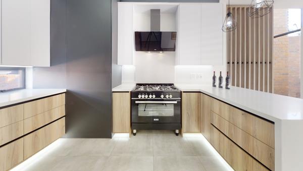 At the heart of the home is a well-appointed kitchen designed for both practicality and style. Finished in a sleek matt black and wood grain colour palette, it creates a striking yet warm focal point. The kitchen also includes a walk-in pantry and a separate scullery, offering excellent storage and convenience for everyday living.