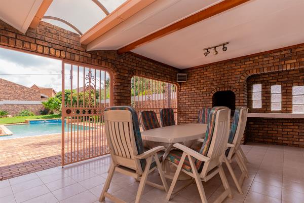 The entertainment area is a standout feature, offering a solid wood bar, covered patio with a built-in braai, and easy access to a sparkling swimming poolperfect for hosting friends and family all year round.