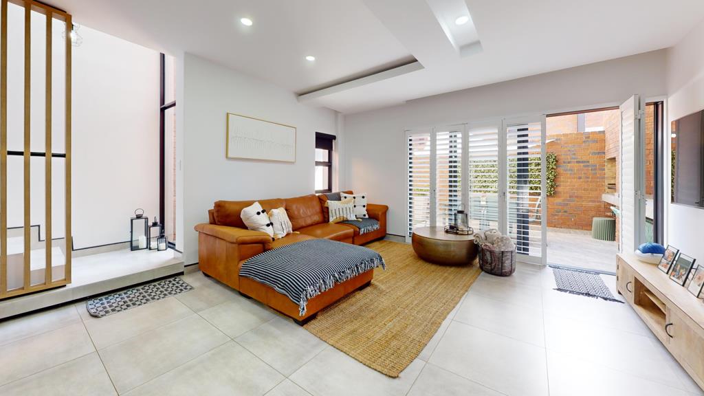 Stacking sliding doors open from the living area onto a private patio with a built in braai, with a neat small garden complete with a discreet washing line perfect for relaxed entertaining.