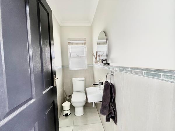 The ground floor is designed for easy living and entertaining. A guest toilet adds convenience, while the modern kitchen stands out with its Caesarstone countertops, central working island, and gas stove. The separate scullery offers ample cupboard space for all your storage needs. The open-plan lounge and dining area, with its inviting gas fireplace, flows effortlessly into the indoor braai and entertainment area. Stacking doors open to the outdoor pool and garden, creating a seamless indoor-outdoor living experience.