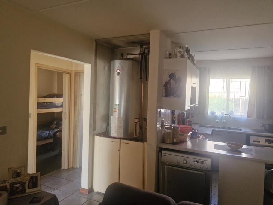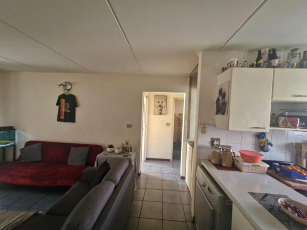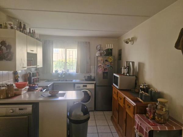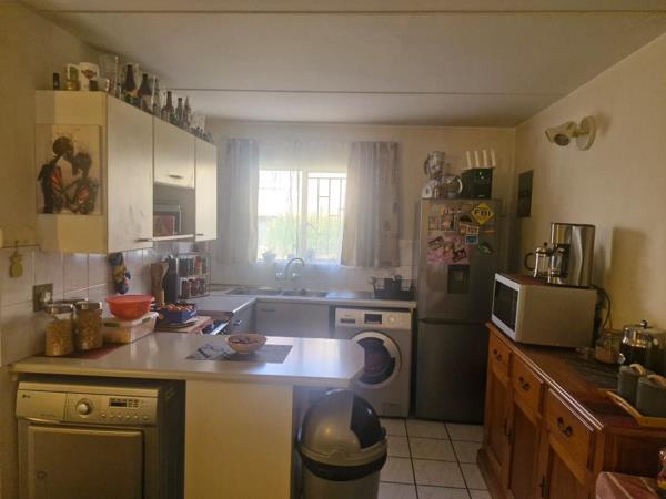 The well-maintained kitchen with a freestanding stove, and convenient spaces for a fridge and washing machine. The generously sized lounge is fully tiled, creating a clean and modern aesthetic.