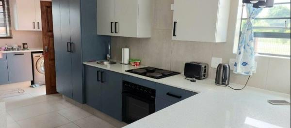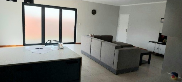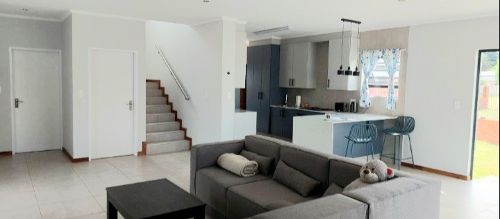 The comfortable open-plan living areas seamlessly flow into a private garden, complete with a braai area, ideal for outdoor gatherings and leisure.