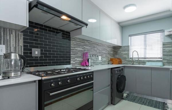 Exquisite gourmet tiled kitchen with Ceasar stone tops, gas stove and ample cupboards, open plan tiled dining area and lounge with stacker doors to garden with braai area, guest toilet with basin.