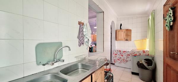 The kitchen is generously sized, offering ample space for cooking and storage, with a layout that facilitates ease of use. A separate laundry room provides practicality and convenience.