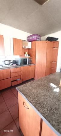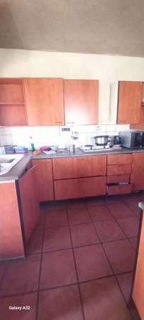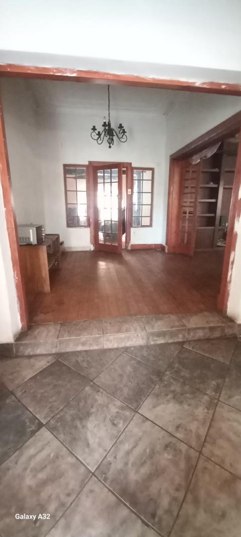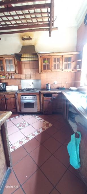 Discover this spacious family home located in the suburban heart of Boksburg South. The interior boasts a functional layout designed for comfortable living, featuring two distinct lounges and two dining rooms, providing ample space for relaxation and entertaining. The kitchen, a central hub, showcases a rustic charm with its natural wood cabinetry, exposed wooden ceiling beams, and terracotta-style tiled flooring. Equipped with a built-in oven and gas hob, alongside generous granite-look countertops and a practical L-shaped configuration, it offers significant storage and a warm, inviting atmosphere. The open-plan design seamlessly connects the kitchen to adjacent living areas, enhancing the flow of the home.