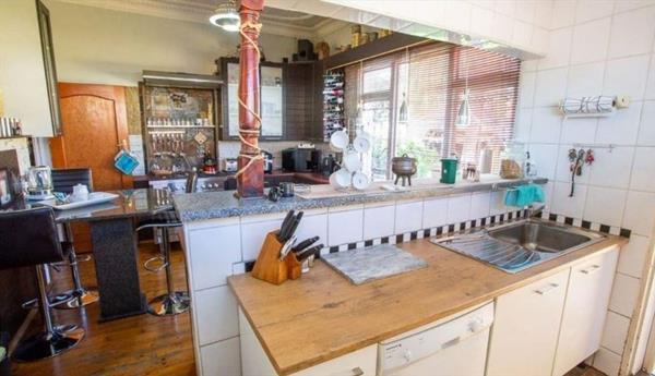 Beautiful kitchen with dark wood cupboards, well planned with gas stove and a separate scullery area.