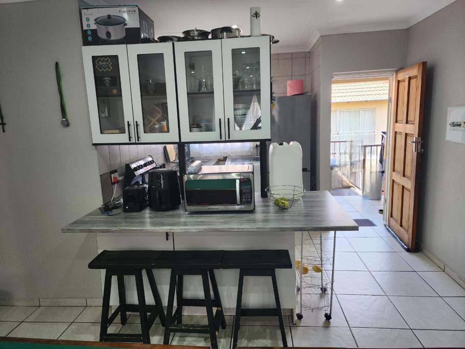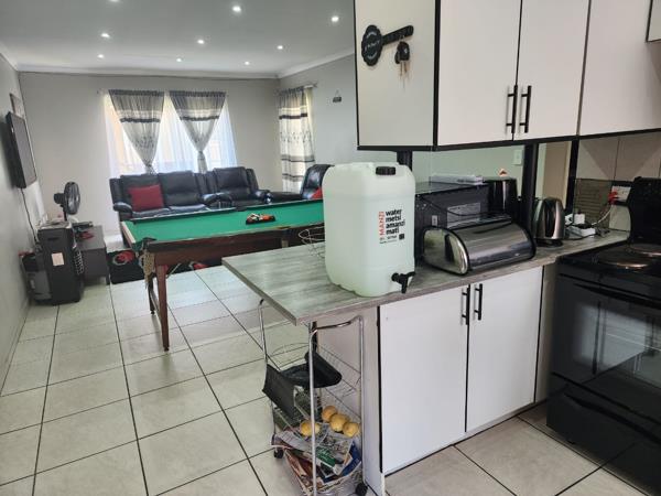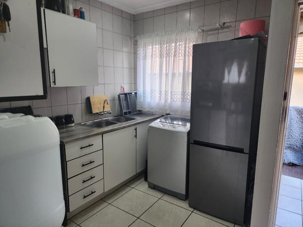 When going to the kitchen there is build in cupboards, breakfast nook, double sink, electric stove, connection for washing machine, space for a single fridge, the kitchen is modernly redone. Fully tiled and has curtain rails.
