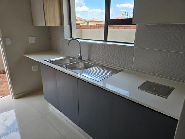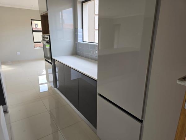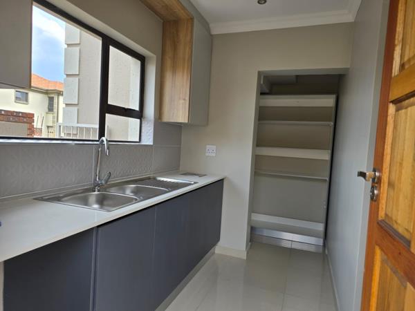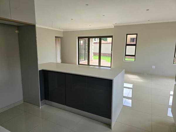 As you step into this beautiful property, an open-plan kitchen catches the eye first. Stunning upmarket cupboards with lots of working and storage space invite you to start cooking. A Centre island with a stove gives you lots of space for laughter with family and friends whilst cooking. The patio leads to the garden, where there is lots of playing space for the kids and the four-legged ones.