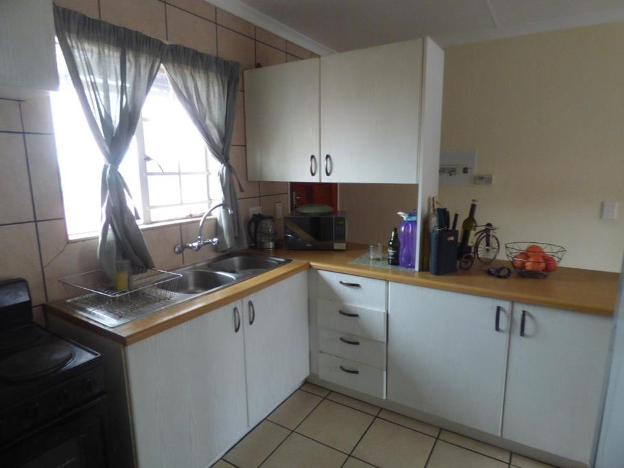 The open-plan kitchen is fitted with built-in cupboards, a double scullery, an electric stove and oven, plus dedicated space for a fridge and washing machine.