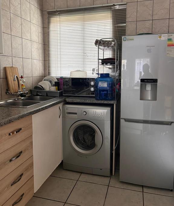 The kitchen is a culinary delight, boasting built-in cupboards with melamine tops, a double basin sink, and a convenient breakfast table. It comes equipped with a four-plate stove and an under-counter oven, all set against the backdrop of stylish wall tiles that reach the ceiling. There''s also space allocated for a front-loading washing machine, ensuring laundry tasks are effortless.