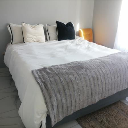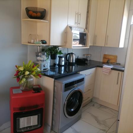 Discover modern living in this well-appointed 2-bedroom, 1-bathroom apartment located within a secure estate in Dawn Park, Boksburg. Spanning a comfortable 49 square metres, this residence is designed for efficiency and contemporary style, ideal for individuals or small families seeking a convenient lifestyle. The interior boasts a bright and inviting lounge area, featuring neutral tones, tiled flooring, and ample natural light, creating a welcoming atmosphere for relaxation and entertaining. A stylish L-shaped sectional sofa and modern glass coffee table enhance the living space, complemented by a wall-mounted TV unit for a sleek finish.