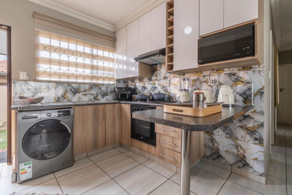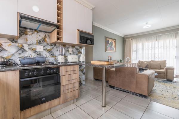 The modern kitchen is fitted with granite countertops, a breakfast counter, built-in wine rack, undercounter oven, 4-plate stove, extractor fan, and space for one under-counter appliance. The kitchen seamlessly flows into the open-plan lounge, which extends to the garden through sliding doors ideal for indoor-outdoor living.