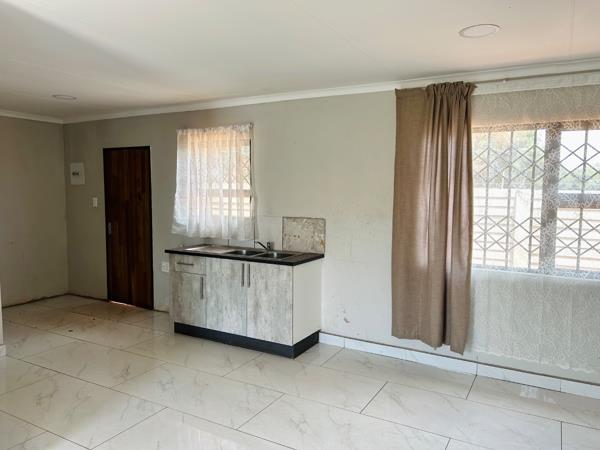 Step inside to an open-plan living area, characterized by modern large-format tiled flooring and a neutral colour palette of grey walls and white ceilings. Recessed lighting adds a contemporary touch, illuminating the space effectively. The functional kitchenette, complete with a sink, provides essential amenities, offering a versatile area for daily meal preparation and entertaining. Natural light streams in through well-placed windows, creating a bright and airy atmosphere throughout.