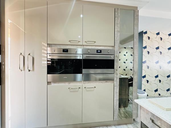 This modern family home offers 4 bedrooms, all fitted with built-in cupboards. The main bedroom features a walk-in closet, a full en-suite bathroom with shower, bathtub, basin and toilet, as well as folding doors opening to a private patio.