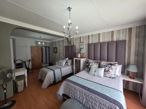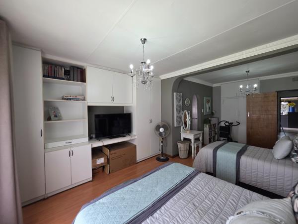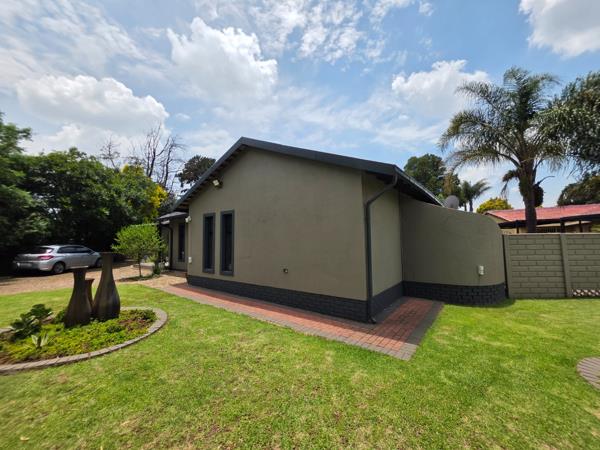 Outdoor living is equally exceptional, with an expansive garden providing a verdant backdrop for relaxation and recreation. A private patio, complete with a built-in braai and an inviting braai room, sets the stage for memorable al fresco gatherings. The property also offers a double garage and three additional parking spaces, catering to all vehicular needs. Pets are warmly welcomed, ensuring a complete family lifestyle.
