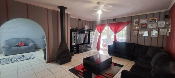 Step inside to a spacious open-plan living area that combines the lounge, dining room, and TV room, all with elegant tiled flooring. The TV room opens through sliding doors onto a covered patio with a built-in braai, perfect for entertaining. The patio overlooks a sparkling marbelite pool, fully enclosed with a safety fence and gate for peace of mind.