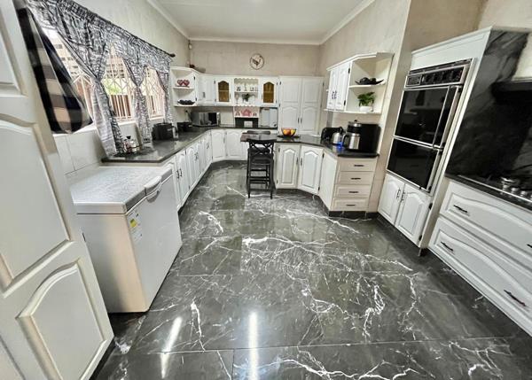 Inside, youll find two spacious lounges, perfect for family gatherings or just chilling out. One features a cozy freestanding fireplace, ideal for those cooler evenings, and both offer ample room for your furniture. The dining room is ready for memorable meals, and the U-shaped kitchen is a real winner with its white cabinetry, dark countertops, and built-in double oven and cooktop whipping up delicious meals will be a breeze. The dark marble-look floor tiles add a touch of modern style.