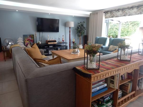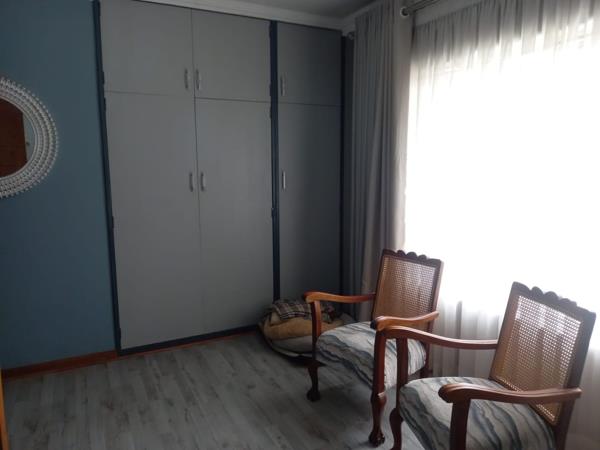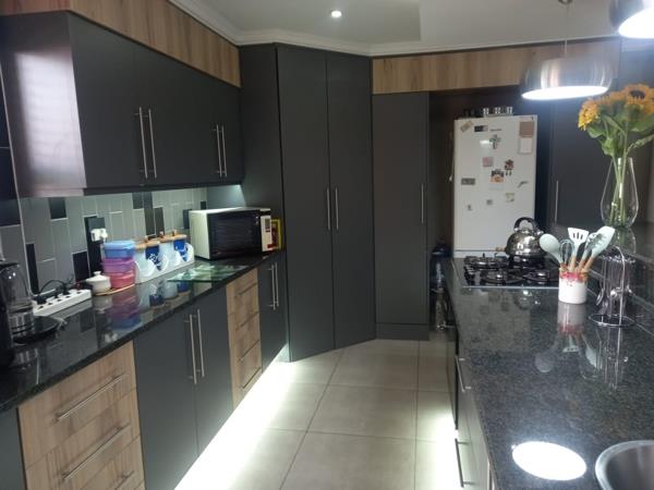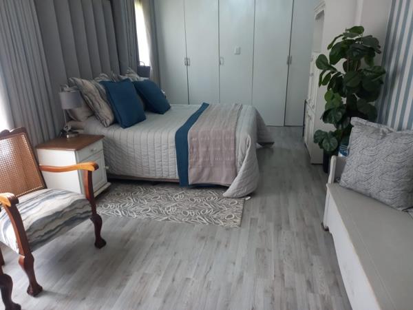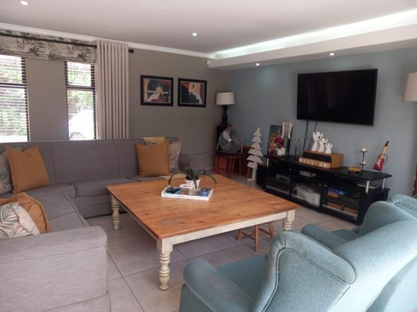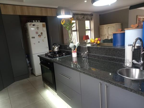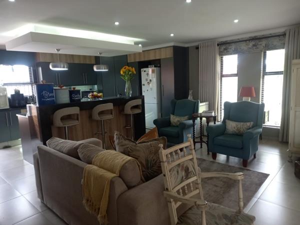 This Gem offers a 3 bedroom with laminated floor and built in cupboards, main en-suite very spacious open plan tiled lounge ,dinning area with stacker doors onto a covered patio with a built in braai and a bonfire area. The kitchen is super modern with a center island with sitting space for 4 , a gas stove , separate scullery area.