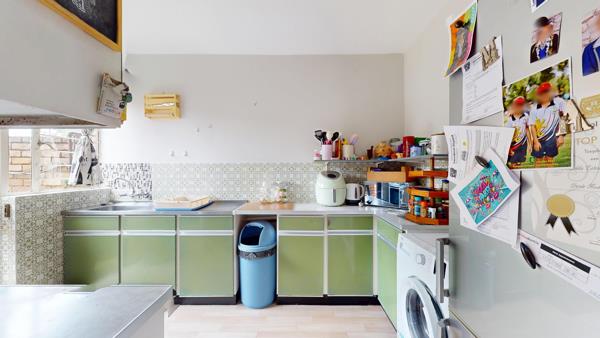 The functional kitchen is conveniently located downstairs, leading out to a practical courtyard with space for a washing line. A guest toilet completes the lower level for added convenience.