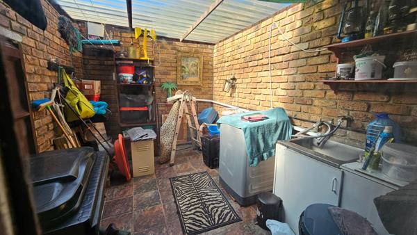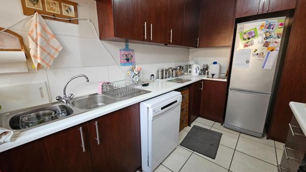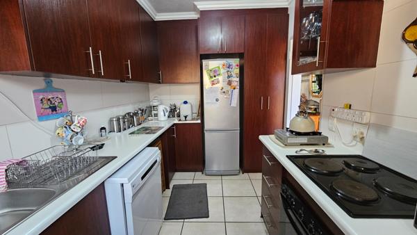 The tiled open plan dining room and lounge flows out to the covered patio and garden. The kitchen is fully equipped with hob, undercounter oven, dishwasher connection and ample cupboard space. The kitchen leads out to an enclosed laundry room with sink and washing machine connection.