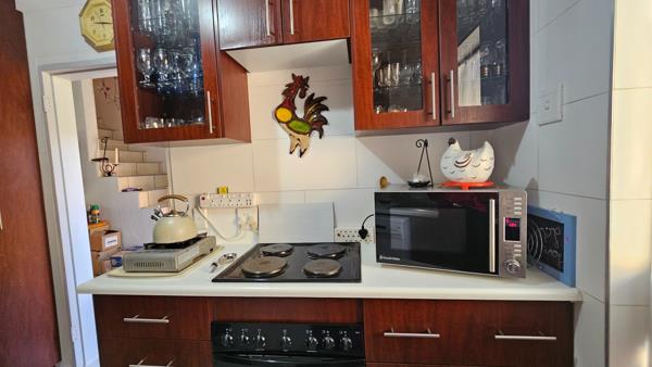 Upstairs has 2 sunny bedrooms with carpeted floors and built-in cupboards, accommodated by a fully tiled bathroom with shower over bath. A guest loo conveniently situated downstairs.