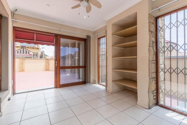 All three bedrooms are carpeted with built-in cupboards, while the main bedroom boasts an en-suite bathroom with a bath. The second bathroom includes a shower for added practicality. The lounge opens up to an enclosed entertainment patio, flowing seamlessly to a lovely lapa area ideal for hosting friends or relaxing with family.