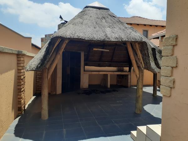 Outdoor living is a delight with a traditional thatched lapa, ideal for entertaining guests or enjoying quiet moments. The extensive paved areas provide low-maintenance outdoor space, complemented by a garden.