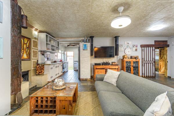 Inside, the home exudes charm with its warm, country-style design. The open-plan layout creates a welcoming atmosphere, while the cozy lounge is enhanced by a built-in sound system and a wood-burning fireplace. The kitchen carries the same character, featuring unique wooden cabinetry, sleek concrete countertops, and a built-in mini wine fridge.