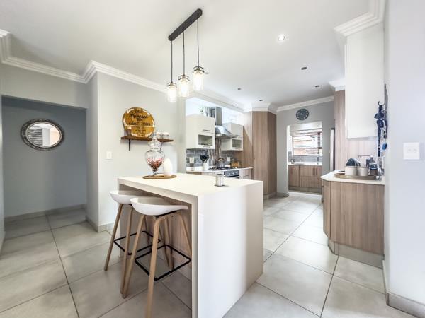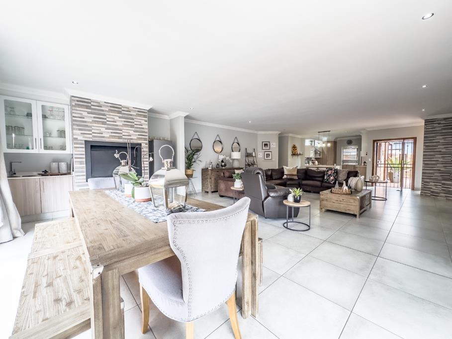 The dining area, enhanced with a built-in braai, is elegantly surrounded by stacking doors that seamlessly open to the sparkling solar-heated pool and beautifully landscaped gardenan entertainer''s paradise!
